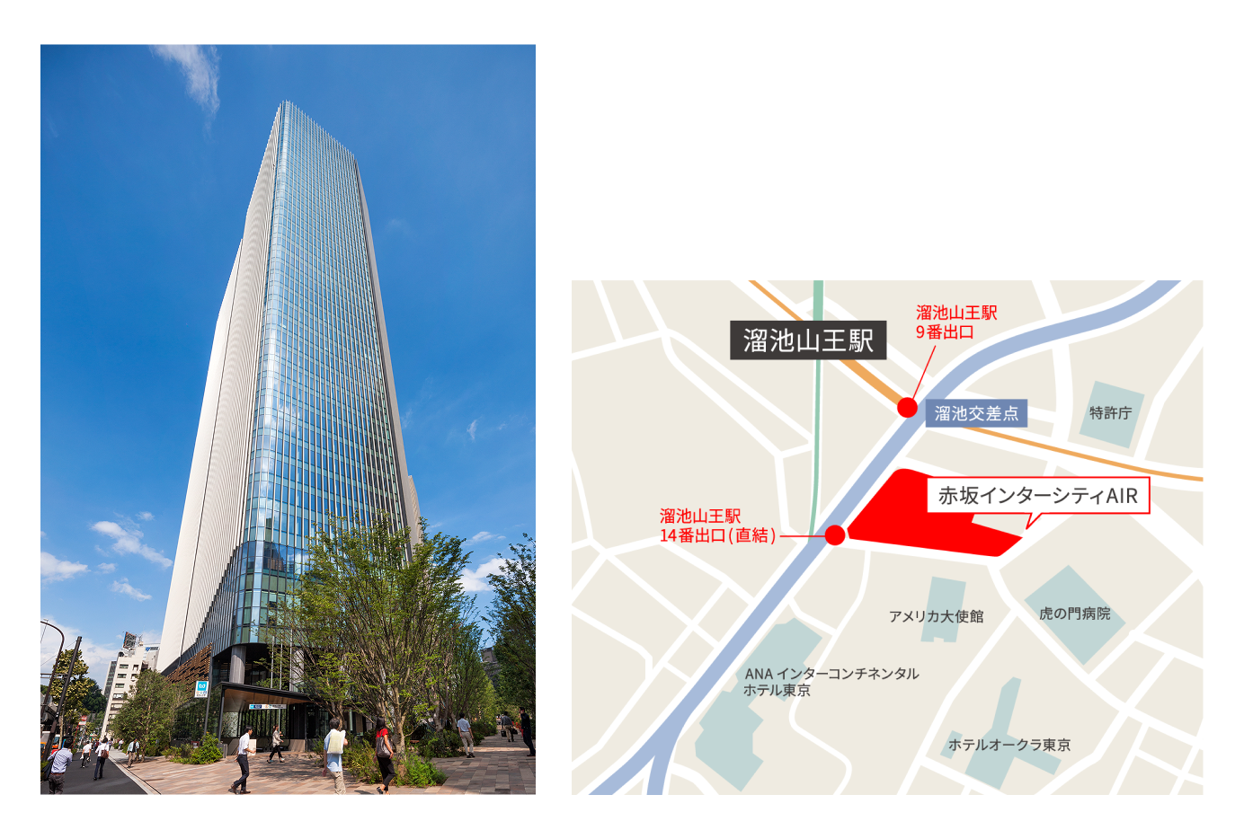 「溜池山王駅」 14番出口直結 (銀座線・南北線) 「国会議事堂前駅」 直結 (千代田線・丸ノ内線) 「虎ノ門ヒルズ駅」 徒歩約5分 (日比谷線) 「神谷町駅」 徒歩約10分 (日比谷線) |