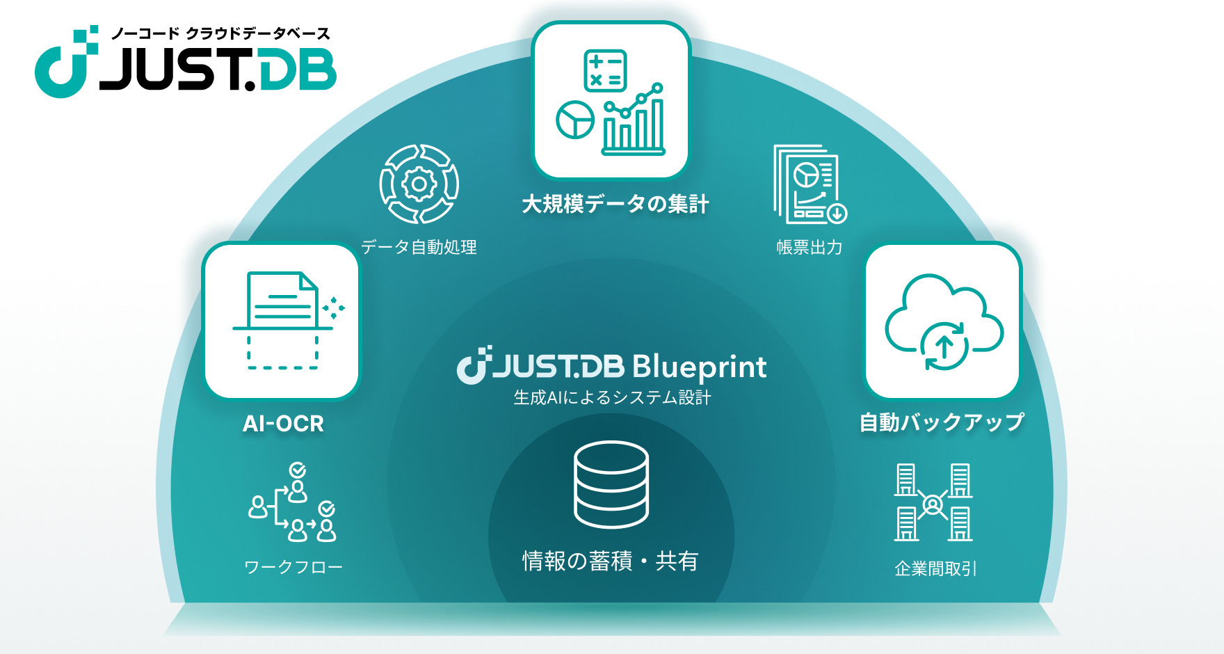 完全ノーコードでありながら、高い拡張性を実現したクラウドデータベースです。数多くの標準機能と、複雑な業務フローも自由にカスタマイズできる「データフローデザイナー」、生成AIを活用した「JUST.DB Blueprint」により、システム構築からデータ集計・分析の自動化までを、完全ノーコードで実現します。また、登録ユーザー数ではなく、同時ログインユーザー数で決まる料金体系を用意しているため、導入にかかる費用や、運用・保守の人的コストを抑えて、企業全体で利用が可能です。