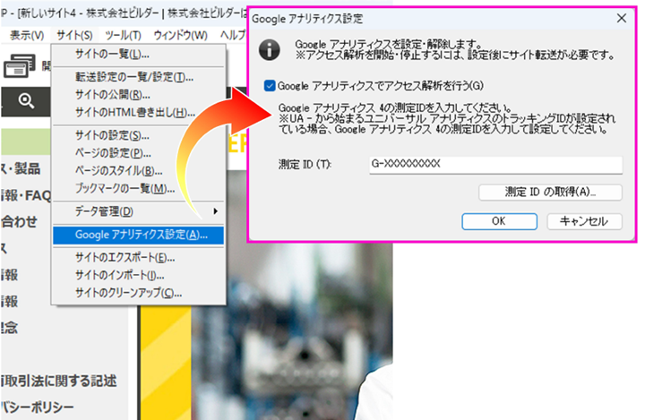 ホームページ・ビルダーで作成したホームページに、アクセス解析サービス「Google アナリティクス」を連携させて利用できます。「どのページをよく見ているか」「どこからのアクセスが多いか」「パソコン・スマホ、どちらの利用者が多いか」などを分析すれば、ホームページ改善への手がかりを得ることができます。