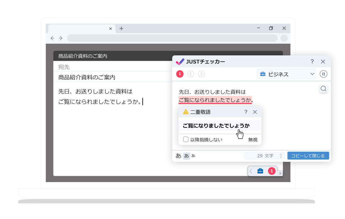 文章校正ブレイン「JUSTチェッカー」は、ブラウザー上で文章校正を行うアプリケーションです。一太郎の高度な文書校正エンジンで文章をチェックできます。