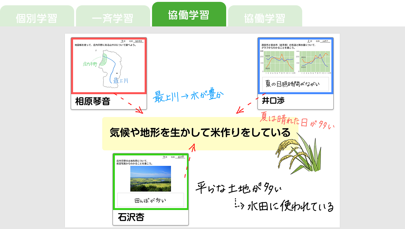 思考テンプレートやふせんなど、活発に意見交換できる仕掛けを用意し、全員参加の協働学習を実現します。