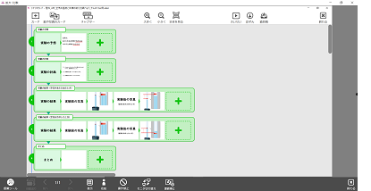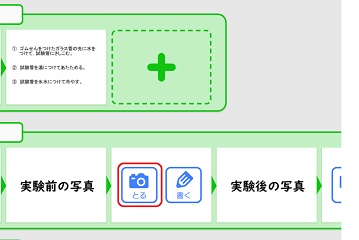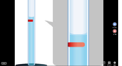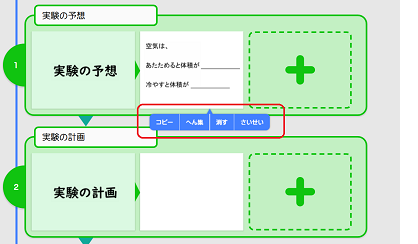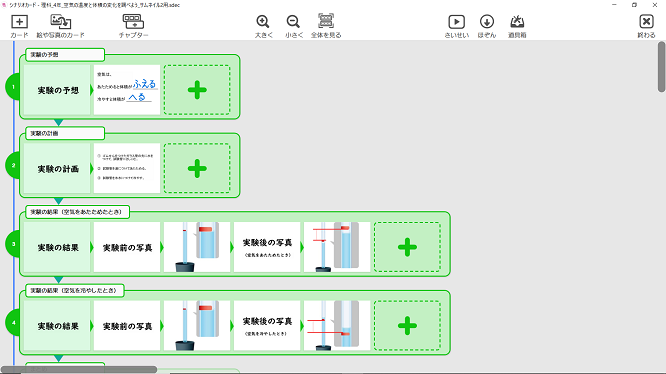 展開 | 2.実験結果を予想し、実験方法を確認する。 ・今回行う実験内容を理解する。 ・試験管内の空気に着目し、空気の温度変化と体積の変化を関連づけながら考える。 ・実験結果の大まかな予想を「シナリオカード」に記入し、グループで話し合う。 ・実験計画を立て、タブレットの「シナリオカード」にまとめる。 ・グループごとに実験計画を発表する。 3.実験をし、結果を記録する。 ・「シナリオカード」を使って、実験前と後の様子を写真で記録する。 ・各グループごとに結果を整理し、実験結果とその考察、わかったことを「シナリオカード」に書く。 4.実験結果を共有する。 ・グループごとに、実験結果やわかったことを発表する。 | ・タブレットで写真を撮る。 ・シナリオカードに写真を貼り、考えをまとめる。 ・考えを共有する。 ・考えを比較する。 |