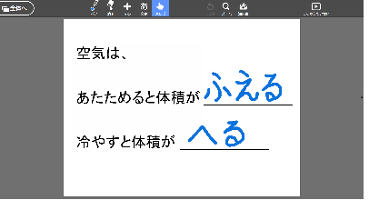 導入 | 1. 本時のめあてを確認する。 ・ 空気の温度を変えると、体積が変わるのかを調べよう。 | ・先生機の授業支援機能から、児童機へワークシートを配付する。 |