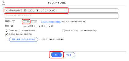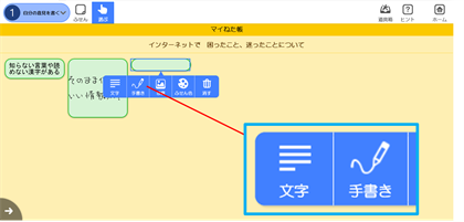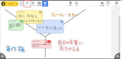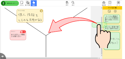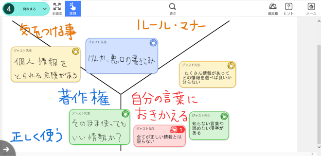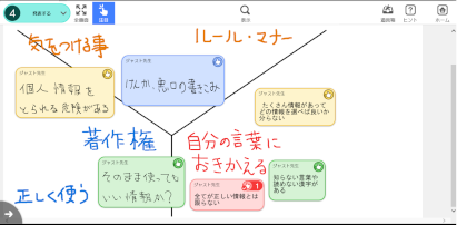 展開 | 3.情報を集めるときや、情報を読みとるときに大切なことについて話し合う。 ・グループになって、「もぞう紙」を使って、話し合う。 ・グループごとに話し合った内容を、全体で共有する。 4.「インターネットを使って集めた情報を学習に生かすには、どのようにすればよいか」について考える。 ・「デジタルノート」に自分の考えを書く。 ・ペアでお互いの意見を共有する。 | ・グループで話し合い、意見を整理する。 |
