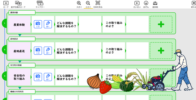 概要 | 「農家の人々のくふうや努力についてまとめる」という課題について、「シナリオカード」を活用して、自分の考え方を整理したり、説明し合う活動を通して、すでに学習した知識をもとに新しい課題を考える力を養う教材です。 | |