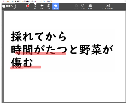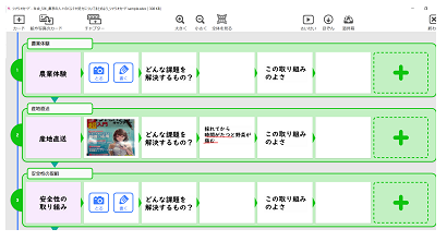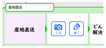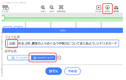 展開 | 3. 準備された複数のテーマに対して、グループになり、それぞれがどの取り組みについて調べるかを話し合う。 4. 個人で、それぞれが選んだ取り組みがどのような課題を解決するためのものかや、その取り組みのよさを「シナリオカード」に書く。 5. 同じ取り組みについて調べた児童どうしで考えを伝え合う。 6. グループで、それぞれが調べた取り組みについて伝え合う。 7. 発表する。 ・農家の人々が抱える課題やそれを解決するためのとりくみについてわかったことを発表する。 | ・配られたシナリオカードのワークシートに書かれている流れで考える。 ・調べた結果や考えをカードに書き込みまとめる。 タッチペンや手書き、およびキーボードを使い、書き込む。 調査に使った資料などを写真に撮って貼り付ける。 ・タブレットを見せ合ったり、ワークシートをつないだりして考えを共有する。 |