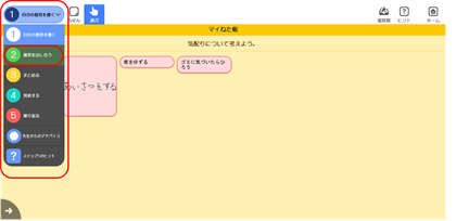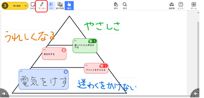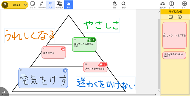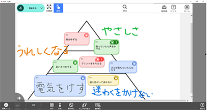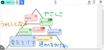 展開 | 2.個人で、前時から今日までに見つけた気配りを整理・分類する。 ・見つけてきた気配りを「デジタルもぞう紙」に入力する。 ・グループで、それぞれの意見の違いを認め合いながら、「思考ツール」の「ピラミッド」を使って、それぞれの意見の整理・分類を進める。 3.整理・分類した資料を全体で発表する。 ・「デジタルもぞう紙」で整理した、さまざまな気配りについて、発表する。 | ・「思考ツール」を使って、見つけてきた気配りを、互いに意見を交わしながら、整理・分類する。 ・電子黒板で全体に発表する。 |
