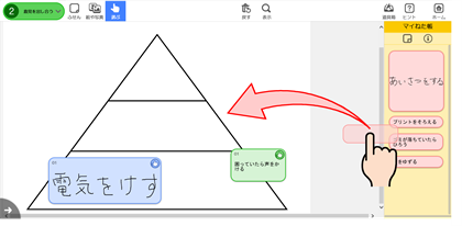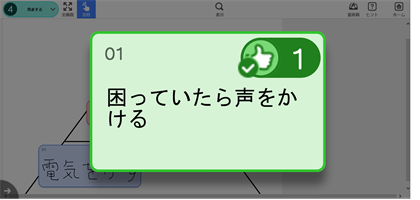 概要 | 「気配りについて考える」という課題について「デジタルもぞう紙」を活用して、お互いに意見を出し合ったり話し合ったりする活動を通して、さまざまな意見の中から考えをまとめる力を養う教材です。 | |