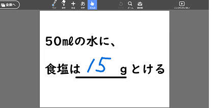 展開 | 2.実験結果を予想し、自分の考えを発表する。 ・食塩やミョウバンが水にとける量には限りがあるのかを予想して、自分の考えを発表する。 ・グループで確認し、代表者が全体に共有する。 3.実験を行う。 ・実験前、実験中、実験後の水溶液の様子を、タブレットで撮影し、記録する。 4.実験結果をまとめ、発表する。 ・実験結果について考察してタブレットでまとめ、写真や映像と一緒にクラス全体に向けて発表する。 | ■実験前、実験中、実験後の水溶液の様子をタブレットで撮影・記録する。 |