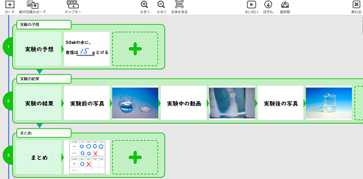 概要 | グループでの活動を基に、「もののとけ方」について実験した結果を「シナリオカード」を活用して記録したり、グループとしての考えをまとめる活動を通して、ものごとの現象をとらえて考察し、評価する力を養うための教材です。 | |