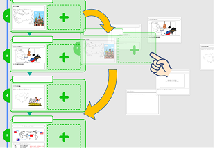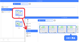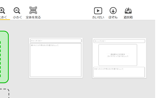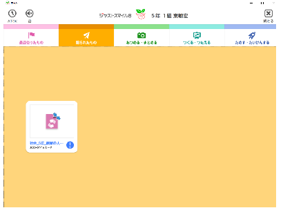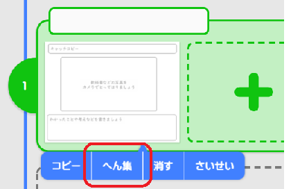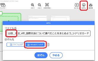 展開 | 2.グループで「シナリオカード」をつくる。 ・前時の学習でノートにまとめた情報を参考にしながら、タブレットに配付された「シナリオカード」に、個人で、調べたことをまとめる。 ・事前に準備していた写真・資料を使って、わかりやすく伝わるようにまとめる。 ・グループでそれぞれがつくった「シナリオカード」をつなげて、発表用の資料をつくる。 3.グループごとに「シナリオカード」を発表する。 | ・事前に調べた情報を元に、文章や写真でわかりやすくまとめる。 ・タブレットで作成したワークシートを電子黒板で共有する。 |
