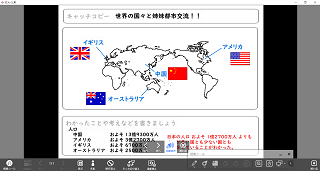 児童が編集したワークシートを、大型掲示装置に表示してクラス全員で共有します。