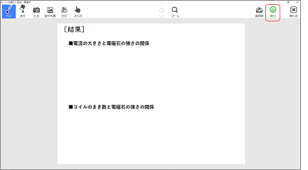 展開 | 3. 実験の計画を立て、結果を予想する。 ・ 予想を「デジタルノート」に記入する。 4. 実験を行い、結果を記録する。 ・ クリップが電磁石に引きつけられるようすを写真で記録する。 ・ 電流の大きさを変えて、電磁石の強さを調べる。 ・ コイルのまき数を変えて、電磁石の強さを調べる。 ・ 実験結果を「デジタルノート」に記入する。 5. 結果をグループで共有し、考察する。 ・ 「電磁石が鉄を引きつける力をより強くするにはどのようにしたらよいか」について考察する。 ・ グループで話し合った内容を「デジタルノート」にまとめる。 | ■ 写真の撮影や結果の記録などを行う。 |