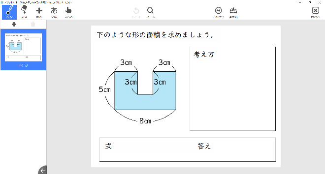概要 | 「長方形を組み合わせた図形の面積を求める」という課題について、「デジタルノート」を活用して、自分の考え方を整理したり、説明し合う活動を通して、すでに学習した知識をもとに新しい課題を考える力を養う教材です。 | |