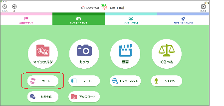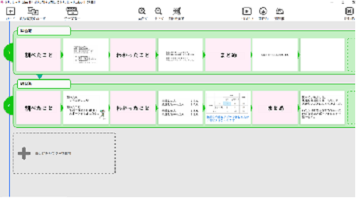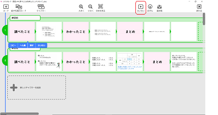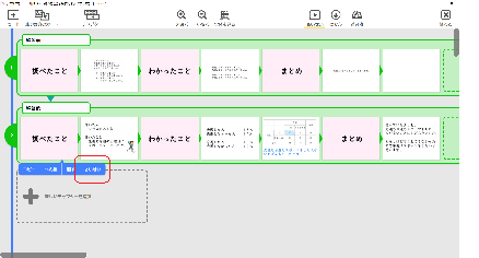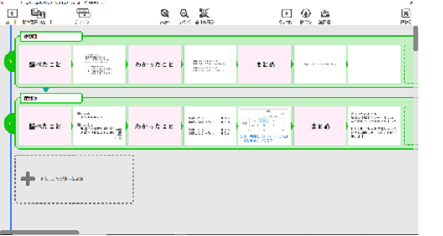 展開 | 2.グループで発表練習をする。 ・タブレット端末にシナリオカードを表示しながら発表する。特にこの部分を聞いて欲しいなどの希望を伝えてから発表する。 3.友達のアドバイスを受け、シナリオを練り直したり、それを使って練習をしたりする。 | ・シナリオを練り直す。 カードのならび順を替える 別のカード(素材)と入れ替える |